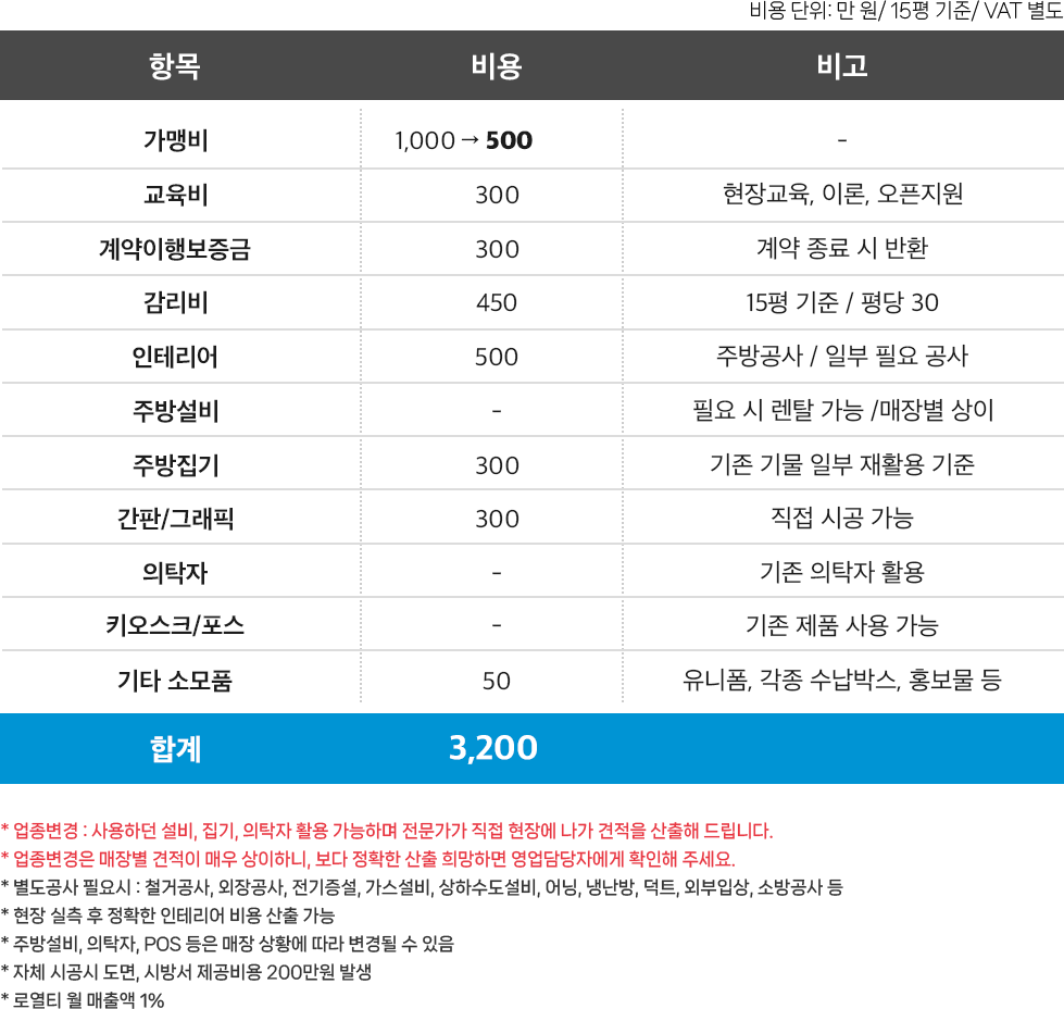 * 상기 투자비용 회수 및 마진율은 상위 가맹점 기준이며,